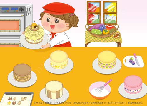 月刊絵本 クッキング 投稿日: 2024年10月3日2026年1月7日 チャイルドブック みんなともだち10月号2024 シールページのイラストです。 シールを貼ってケーキを完成させるイラストです。 カテゴリー 作品紹介、絵本、食品・料理イラスト タグ 児童書/幼児向け、食品・料理イラスト.